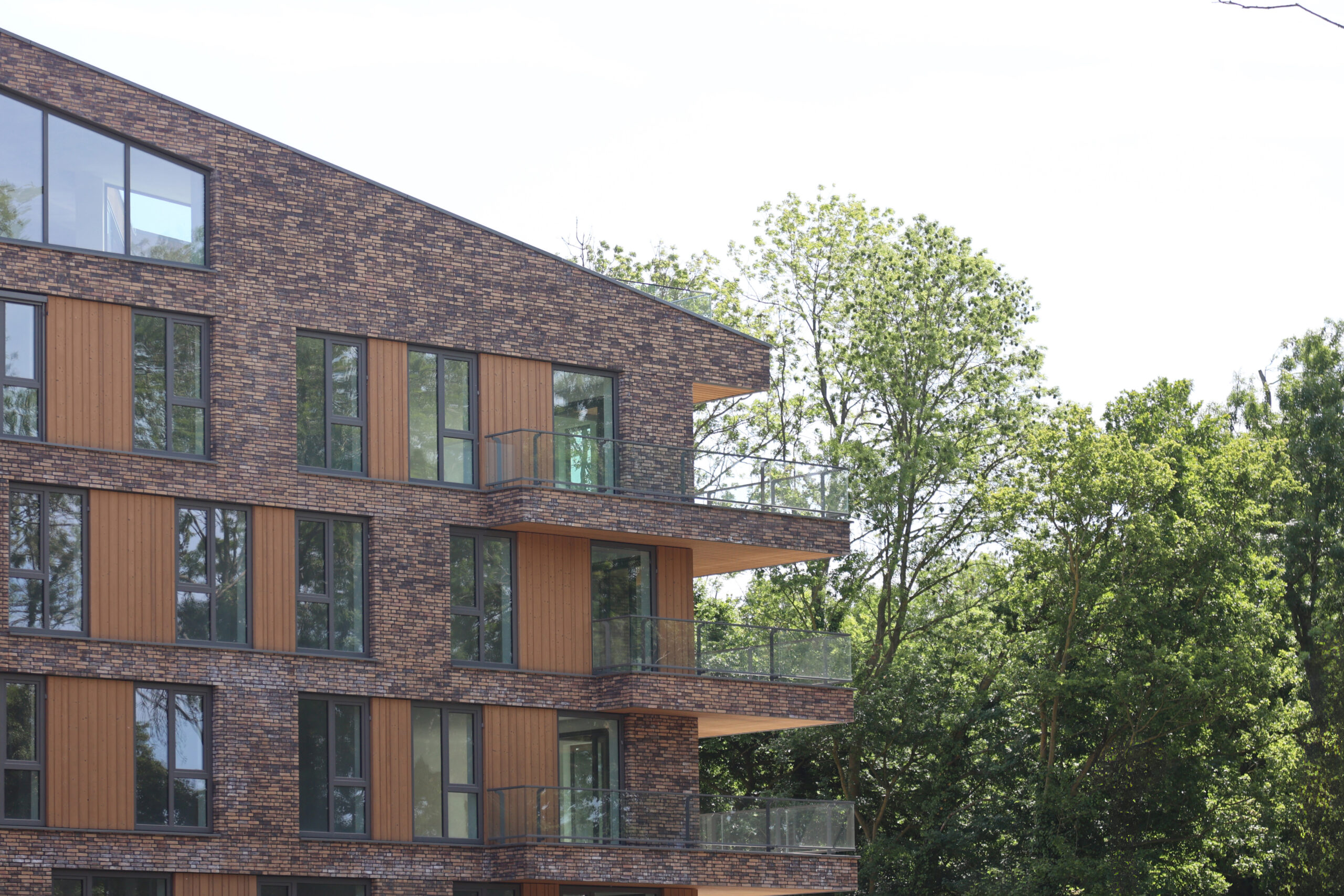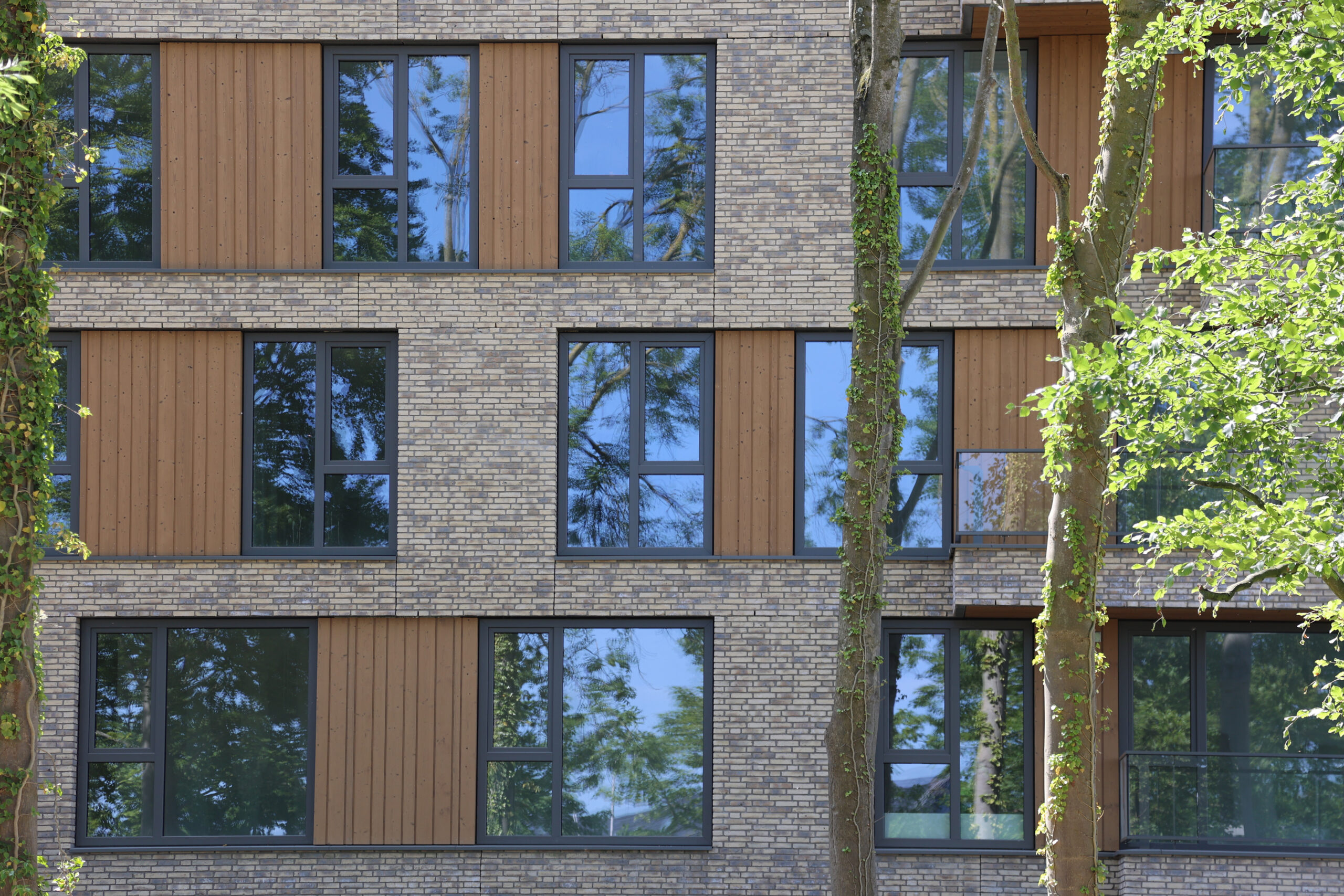 Voor de houten accenten is ons Syde profiel toegepast in drie verschillende breedtes. Daardoor krijgt de gevel ritme en schaduwwerking, zonder druk te worden. Het hout is uitgevoerd in thermisch gemodificeerd vuren, en een deel is brandvertragend behandeld met Flamefix Outdoor, zodat brandklasse B wordt behaald.