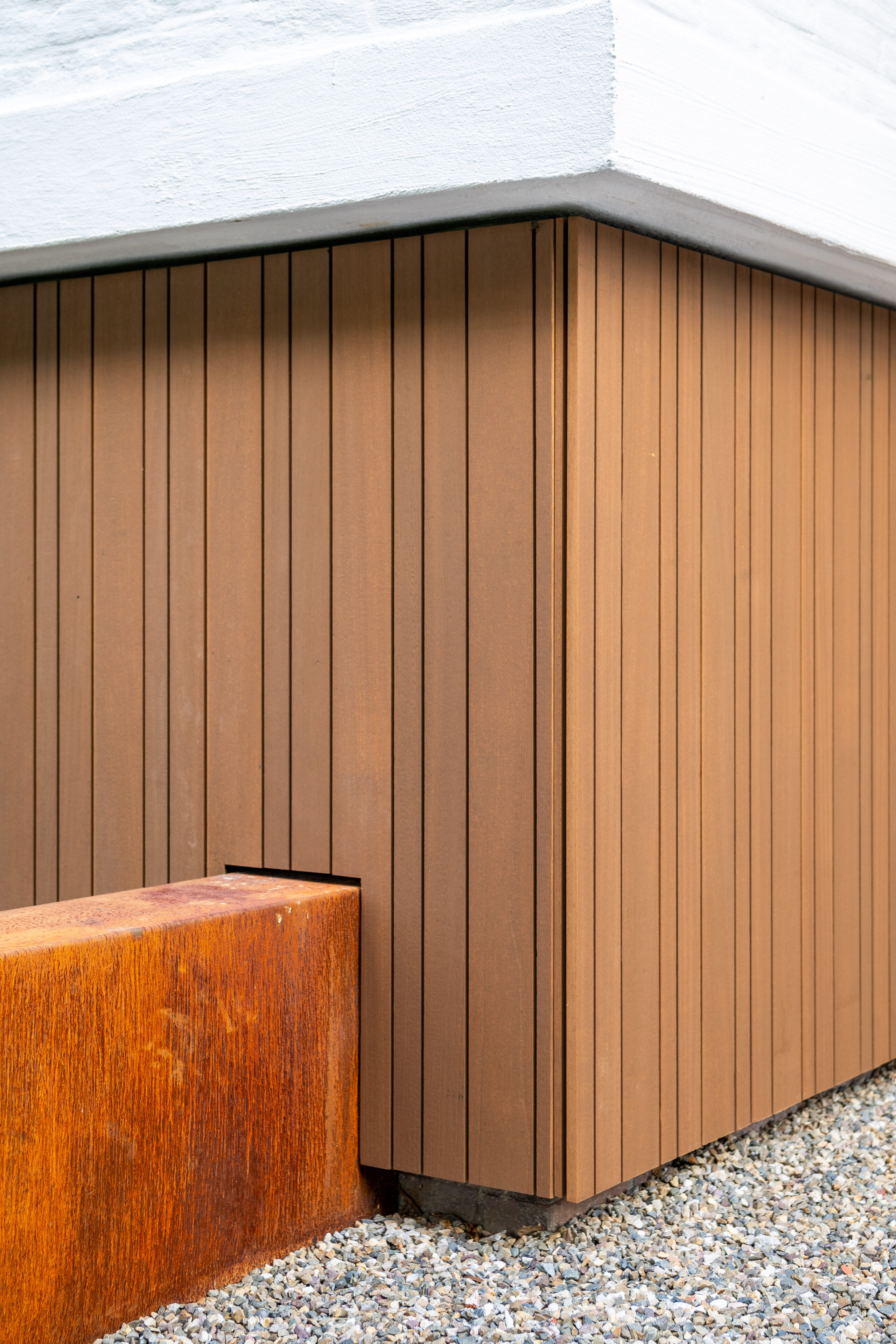 Het bijzondere van het Kode-profiel? De schijnsponningen die we in het hout frezen creëren de suggestie van een open gevel, terwijl de dikte van 32 mm zorgt voor een mooie schaduwwerking. In combinatie met wisselende optische plankbreedtes geeft dit precies het Bar(Kode)-idee: een speels, ritmisch effect dat de gevel tot leven brengt.