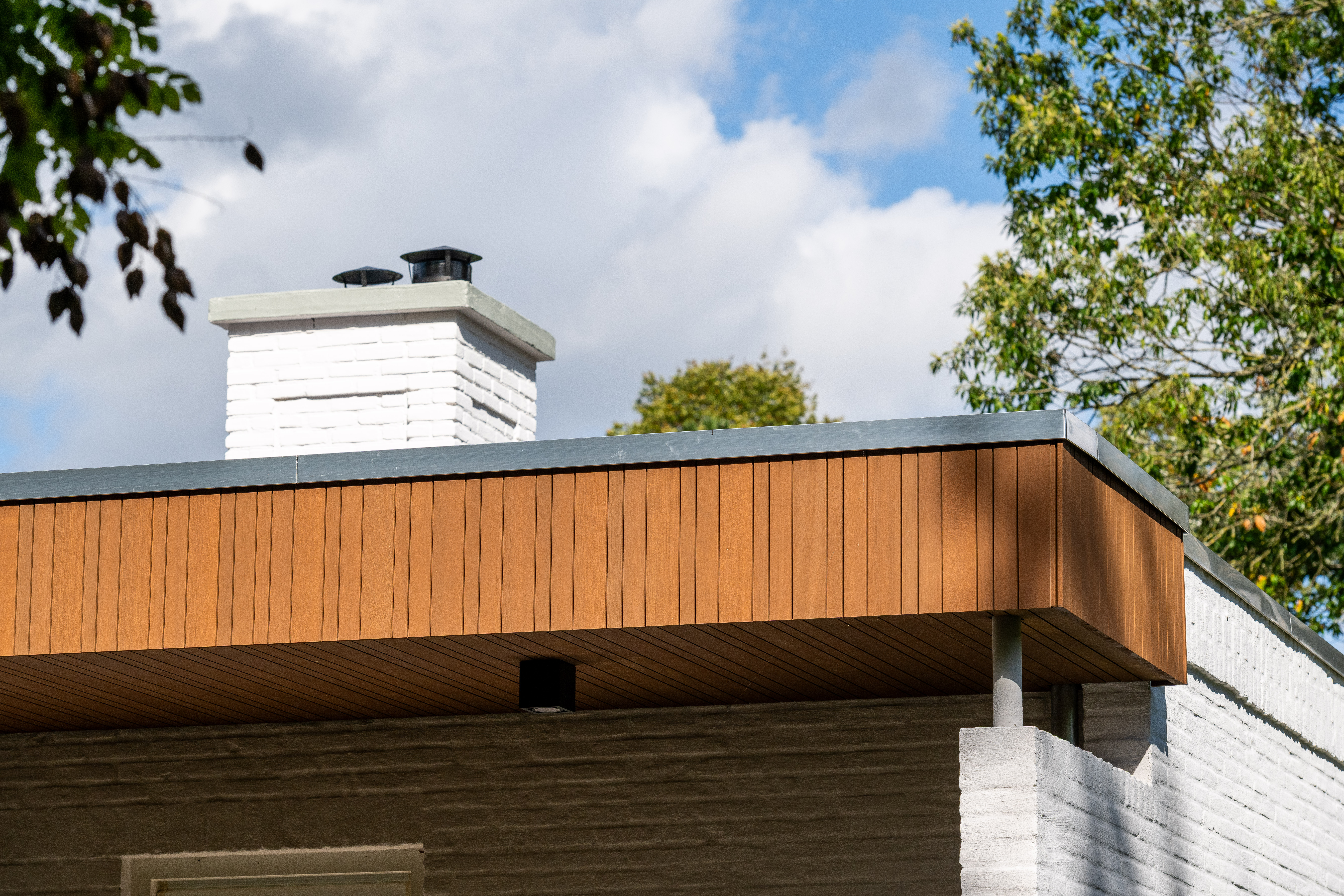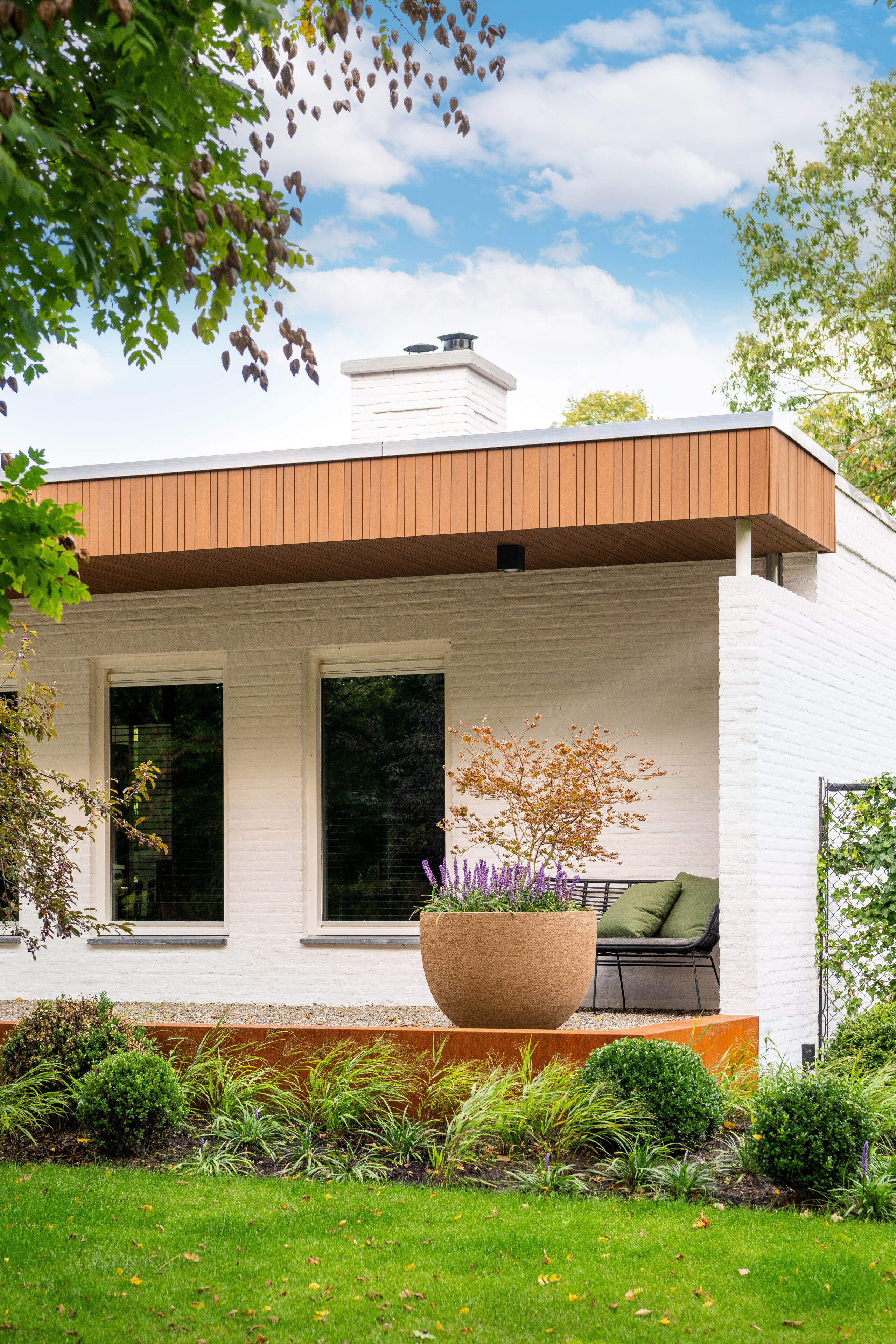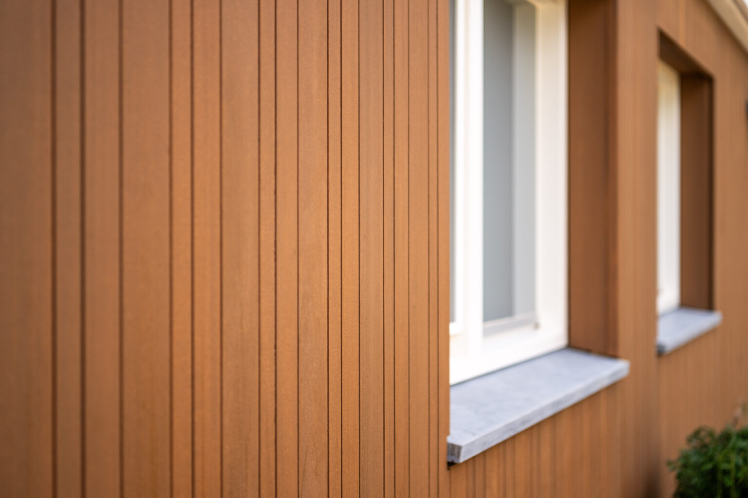Wie zegt dat een jaren ’70-huis niet kan transformeren tot een moderne eyecatcher? Met ons Kode 1 en Kode 2 profiel (32 mm dik) in thermisch Ayous en de Varmé-kleurige WoodCream hebben we dit huis een complete make-over gegeven.